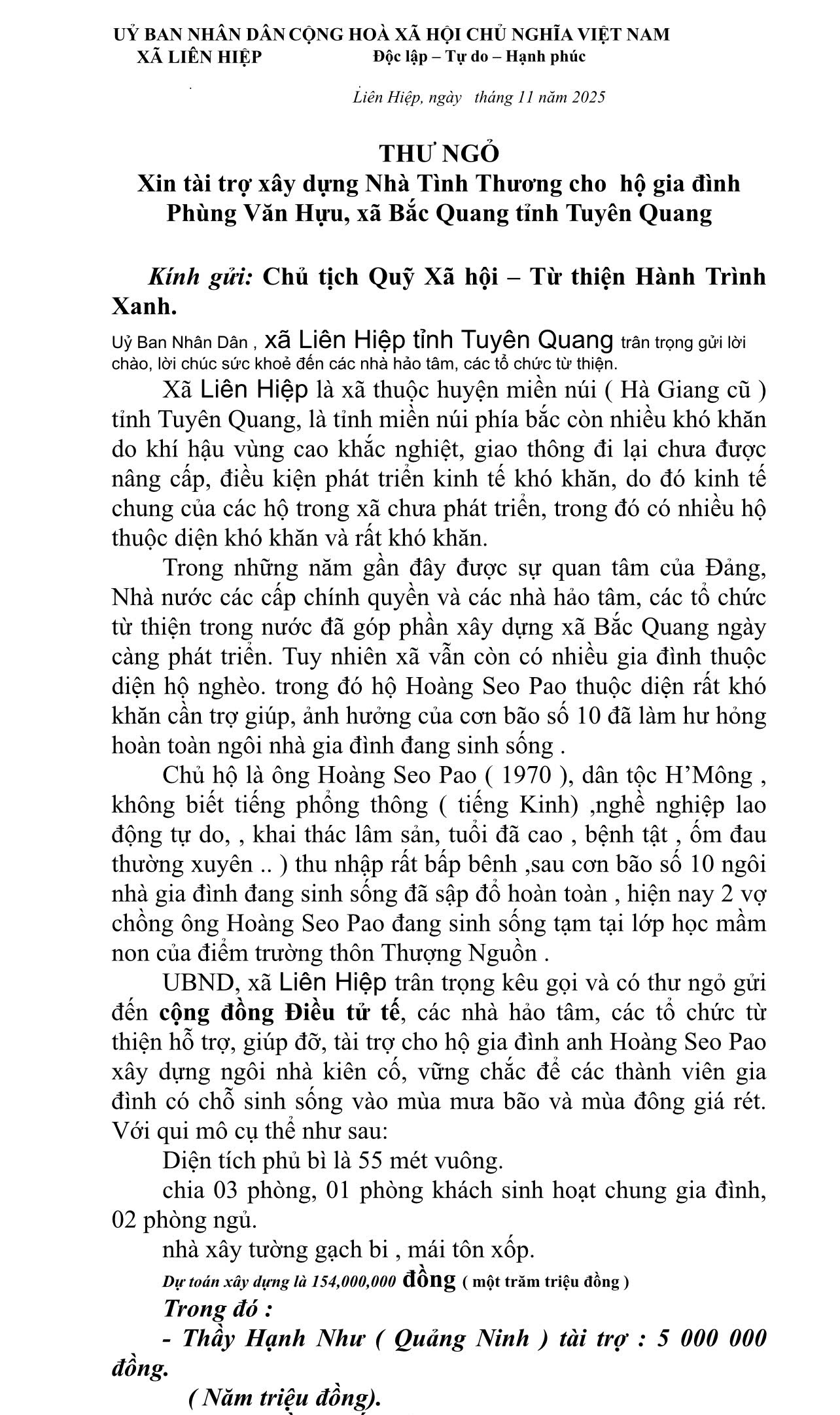 🌿 LỜI KÊU GỌI ỦNG HỘ XÂY NHÀ CHO GIA ĐÌNH ÔNG HOÀNG SEO PAO – THÔN THƯỢNG NGUỒN, TUYÊN QUANG 🌿